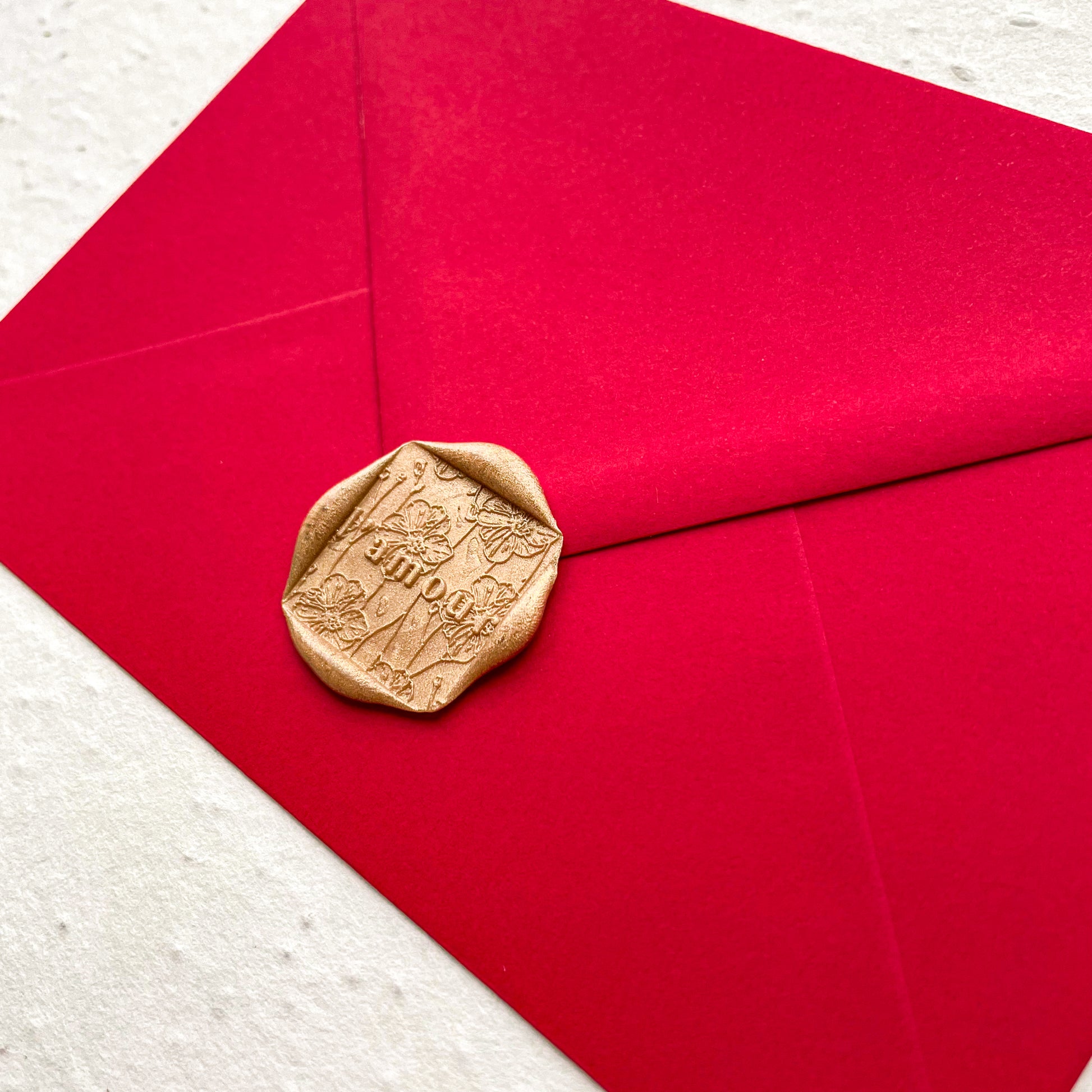 This card includes a red envelope and a complementary self-adhesive wax seal in gold, featuring the word "l'amour" on it. Easily apply the seal for a polished and complete look to your envelope.
